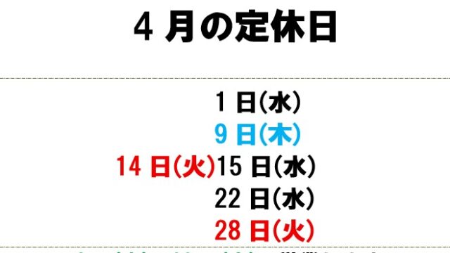 定休日 4月の定休日 ※ 8日(水曜日)・29日(水曜日・昭和の日)は営業します ※ 9日(木曜日)・28日(火曜日)はお休みです ※ 4/29~5/6は17時閉店です ご注意ください 2026.03.29 定休日